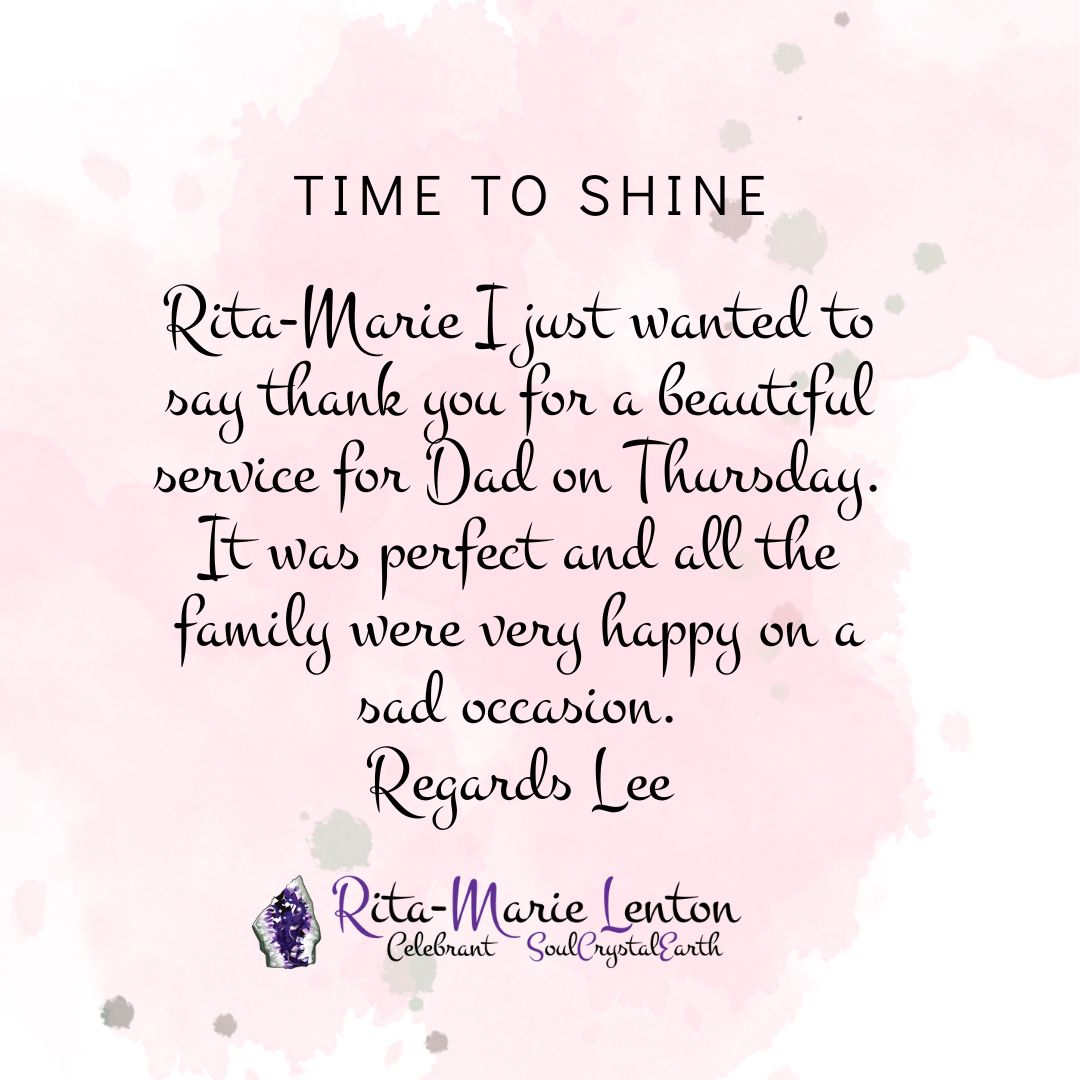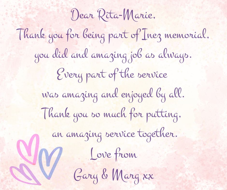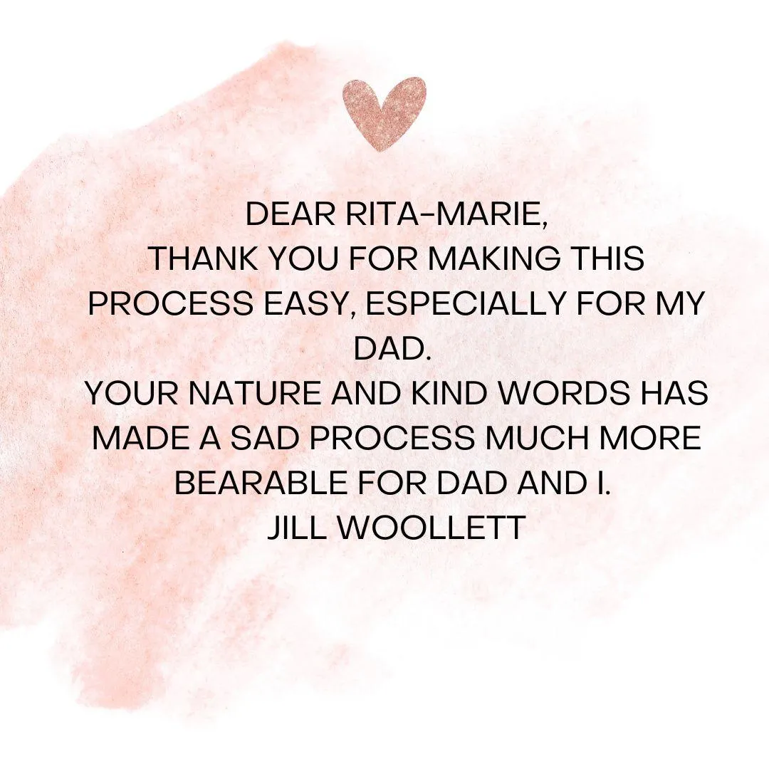 For those seeking a compassionate and experienced Funeral Celebrant, Rita-Marie is here to provide guidance and support. She is committed to crafting ceremonies that bring comfort, healing, and a meaningful farewell.